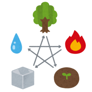 この世のあらゆる事物、現象は、木(もく)・火(か)・土(ど)・金(こん)・水(すい)の五つの要素からできているという考え方です。