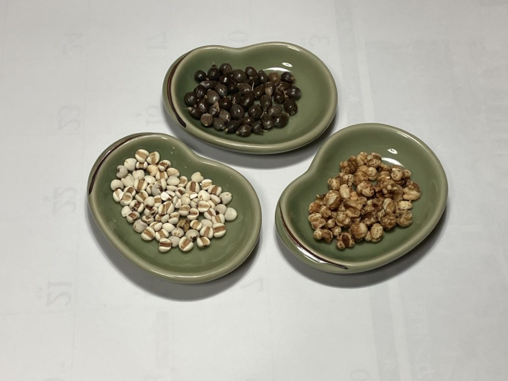 写真 上から左回りに 皮付きハトムギ 皮去りハトムギ 皮去り焙じハトムギ