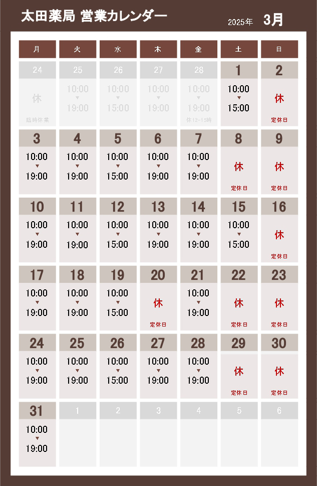 2025年4月の営業スケジュールはこちらです。一部、変則的にお休みさせていただきますのでご了承ください。