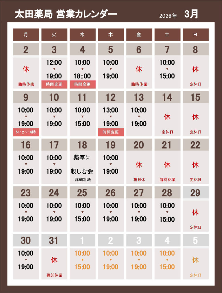 2026年3月の営業スケジュールはこちらです。