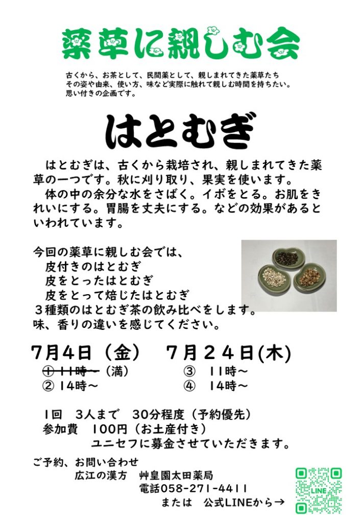 古くから、お茶として、民間薬として、親しまれてきた薬草たち。その姿や由来、使い方、味など実際に触れて親しんでもらいたい。そんな思いで始めました。今回は はとむぎ 詳しくは下記をご覧ください。